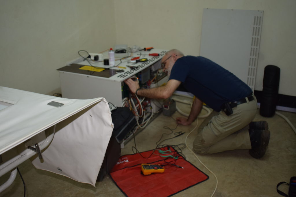 The first surprise came from Dominique Schmid, who had accompanied us on our mission in March 2018. He found an identical discarded mobile X-Ray machine in the basement of the Cantonal Hospital and thanks to Samuel Grenier and a Siemens engineer, we were able to extract its capacitors, and take them with us. (3 x 11 Kg !!!!)
