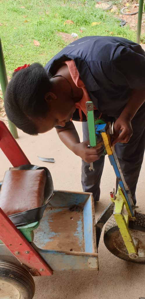 We also had an orthopaedic sole made by local craftsmen for a young man with a shortened leg. We also had the chain repaired on an abandoned tricycle in order to use it for the re-education of some children.