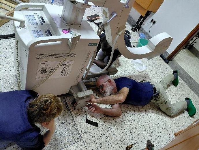 At 11 o’…clock at night, he was still repairing the tyres of the C-Arc , which was no longer mobile. He replaced the rubber as best he could with material which was no longer needed for making splints in occupational therapy. Thank you Marie !