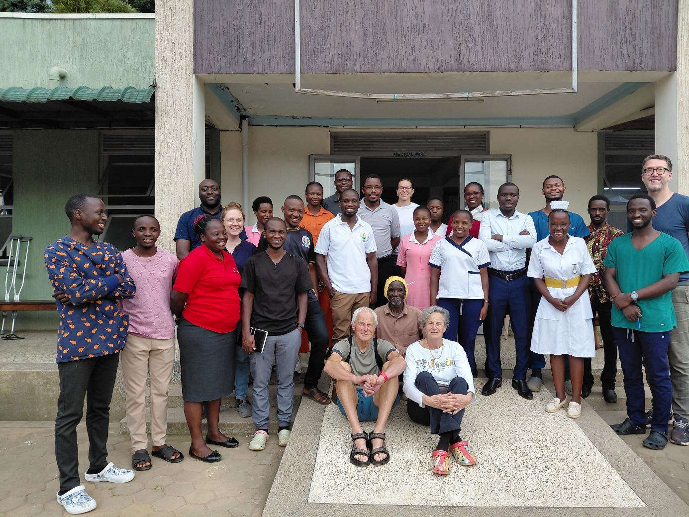 Here with nurses and, on his right, Dianah the physiotherapist, who is not Batwa (Pygmy)!