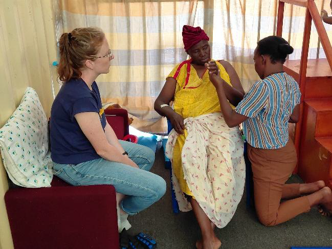 Dianah est seule et prépare un bachelor – que nous sponsorisons- avec des études pendant les fins de semaine et reprise du travail le lundi. Elle déborde de demandes et s’occupe en outre des handicapés, notamment beaucoup d’enfants infirmes moteurs cérébraux. Ses conditions de travail sont pénibles. Elle voit les patients dans un conteneur d’accès difficile pour les chaises roulantes ou les personnes avec des cannes car en terrain vague sans chemin balisé.